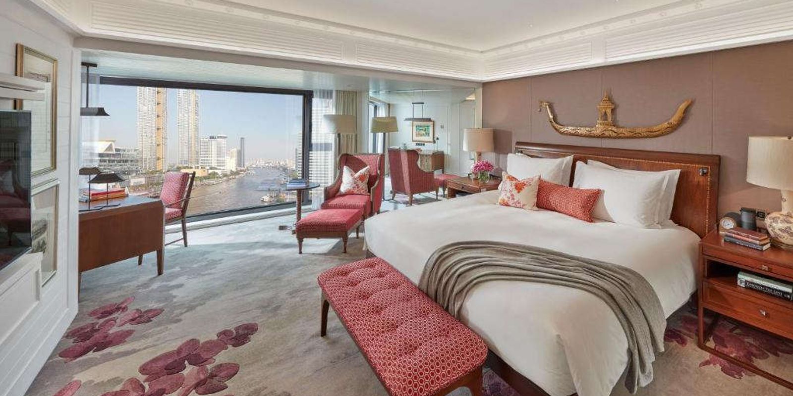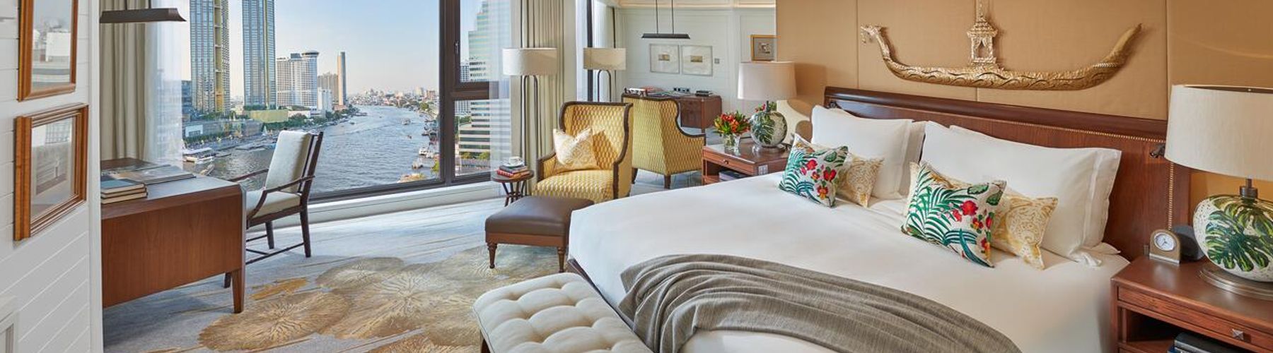 Mandarin Oriental, Bangkok — легендарный отель на берегу реки Чао Прайя с богатой историей, насчитывающей более 140 лет. Отель сочетает в себе элегантность колониальной архитектуры и современные удобства, предлагая гостям роскошные номера и сьюты с видом на реку или сады. На территории отеля находятся несколько *ресторанов, включая отмеченный двумя звёздами Michelin Le Normandie с изысканной французской кухней.