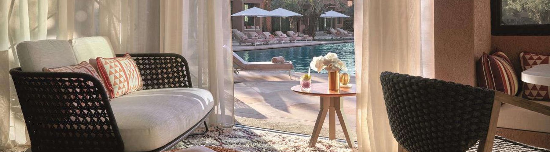 Royal Mansour Marrakech — грандиозный отель в самом сердце Марракеша, построенный по инициативе короля. Проект задумывался как символ марокканского гостеприимства на высочайшем уровне, объединяющий традиционную архитектуру и ремесленные техники с ультра-роскошным сервисом. Здесь 53 частных риада, каждый из которых уникально оформлен с использованием аутентичных материалов, весь декор выполнялся вручную. Во всех риадах есть террасы и частные бассейны на крыше, откуда открывается вид на город и Атласские горы, что создаёт атмосферу абсолютного уединения.